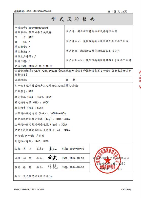 低壓成套開關(guān)設(shè)備MNS型式試驗報告