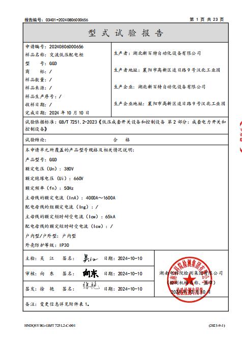 低壓開(kāi)關(guān)柜GGD型式試驗(yàn)報(bào)告